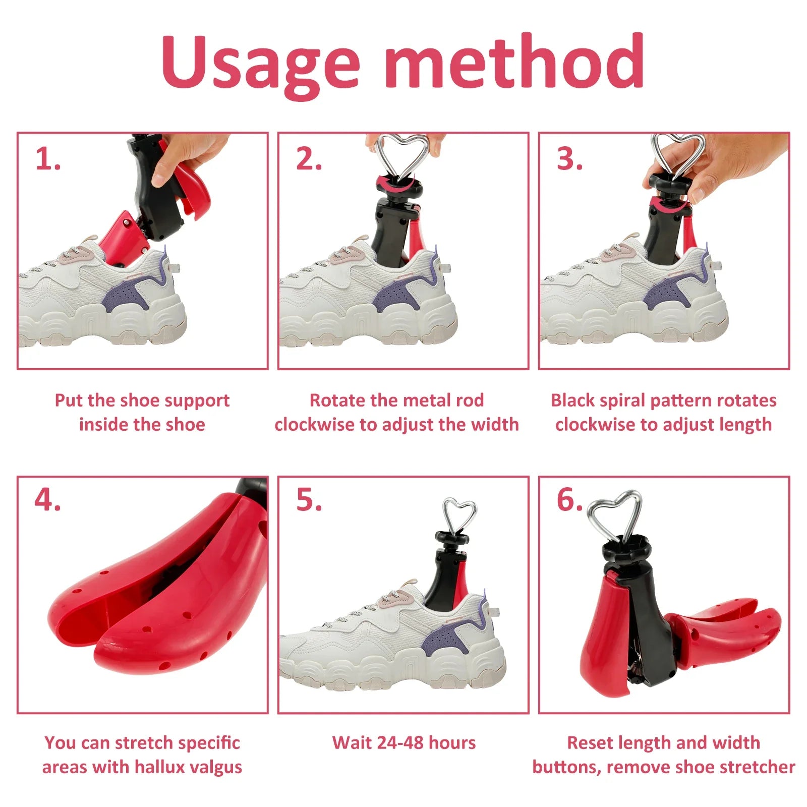 Easy to Use: Simply insert the stretcher into your shoe, push forward, and turn the length knob clockwise. Within 24–48 hours, your shoes adjust to a comfortable fit.