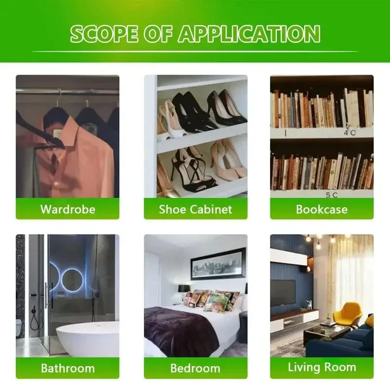 Each bag works like a silent humidity fighter, pulling moisture from the air and locking it inside to help prevent mold, mildew, rust, and fabric damage. Simply hang them in your wardrobe, bathroom, laundry room, shoe cabinet, storage box, or even your car for effortless moisture control with zero electricity required.