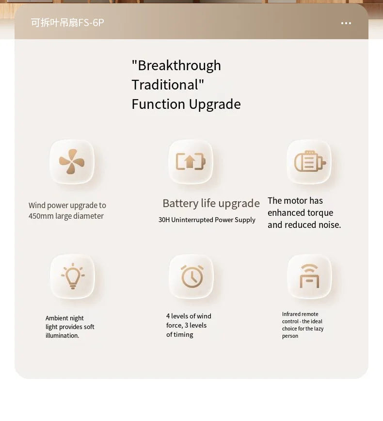 Stay cool anywhere with the 12000mAh Portable Ceiling Fan, the ultimate outdoor companion for camping, tents, or indoor use! Featuring a 450mm enlarged fan blade, this compact fan delivers powerful airflow and wide coverage without taking up too much space. Its remote-controlled functionality allows you to adjust speed, lighting, and set a timer (2–8 hours) for hassle-free comfort. With a massive 12000mAh battery, enjoy up to 30 hours of continuous cooling, making it perfect for long camping trips or outdoor adventures. The detachable fan blades make cleaning and transportation easy, while built-in safety features stop the fan automatically upon collision—ideal for tight tent spaces or family use.