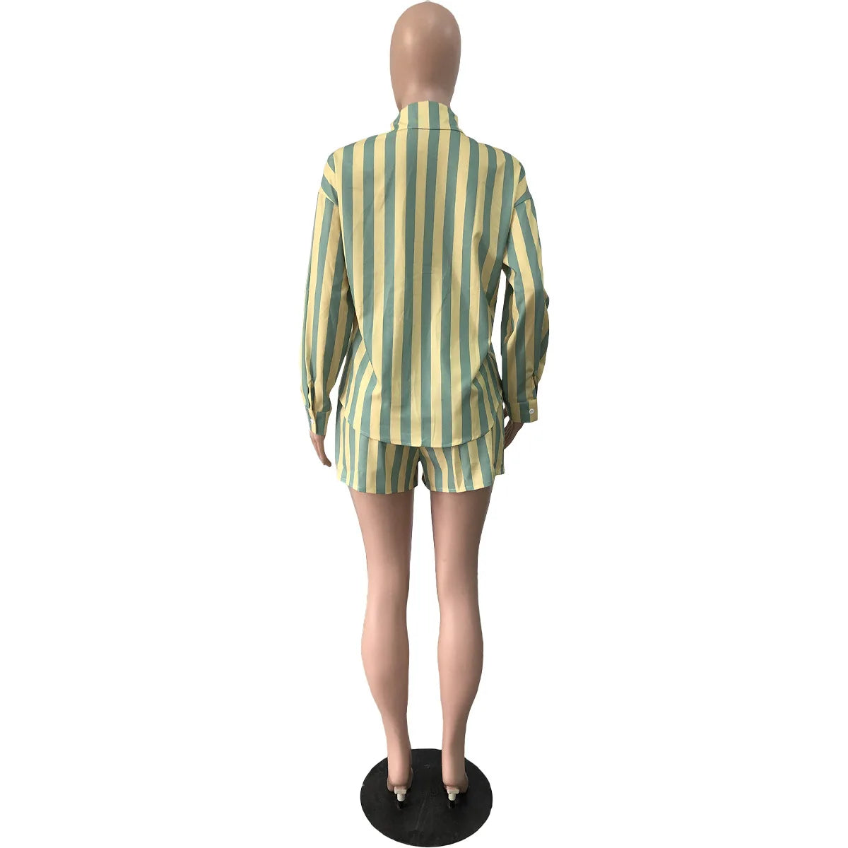 2025 Women’s Casual Striped Shorts & Long Sleeve Shirt Set – Spring Summer Office & Vacation Outfit