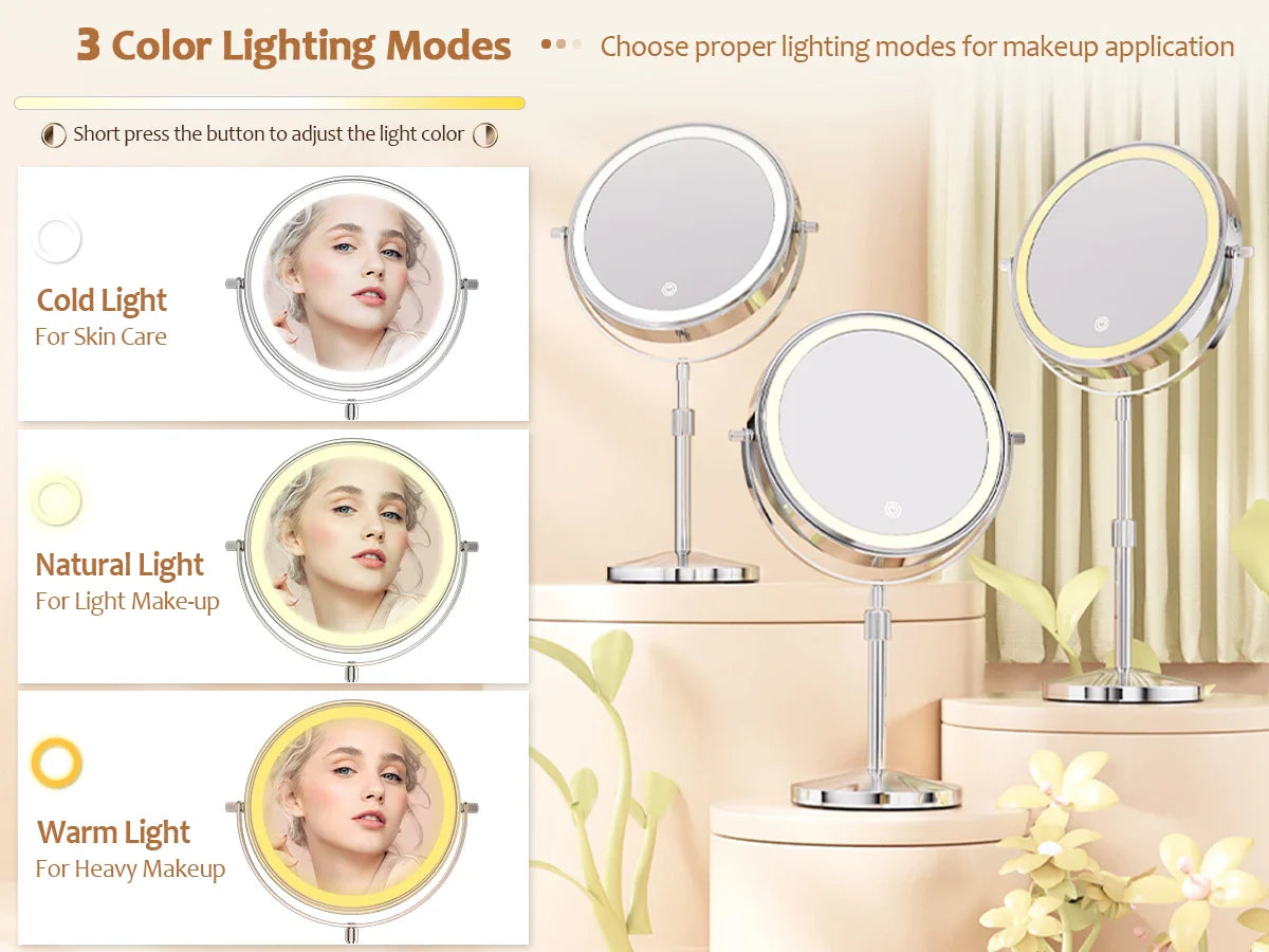 8-Inch Makeup Mirror with Light – 10X Magnification, 3 Color LED, Adjustable Brightness & Height Standing Cosmetic Mirror