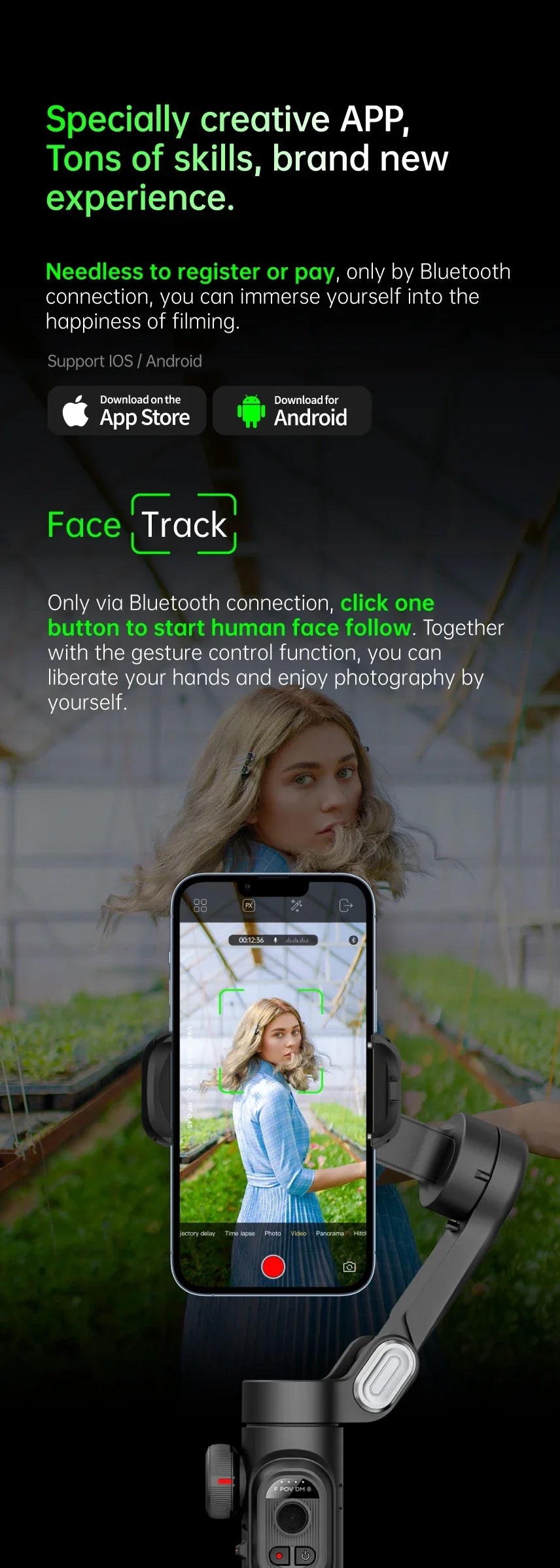 With Bluetooth connectivity, controlling your gimbal is seamless and intuitive. The 3-axis stabilization ensures smooth panning, rolling, and tilting, while its lightweight plastic construction (350g) makes it easy to carry anywhere. The gimbal supports multiple languages, including English, Japanese, French, Spanish, German, Russian, Korean, and Dutch, making it accessible for global creators.