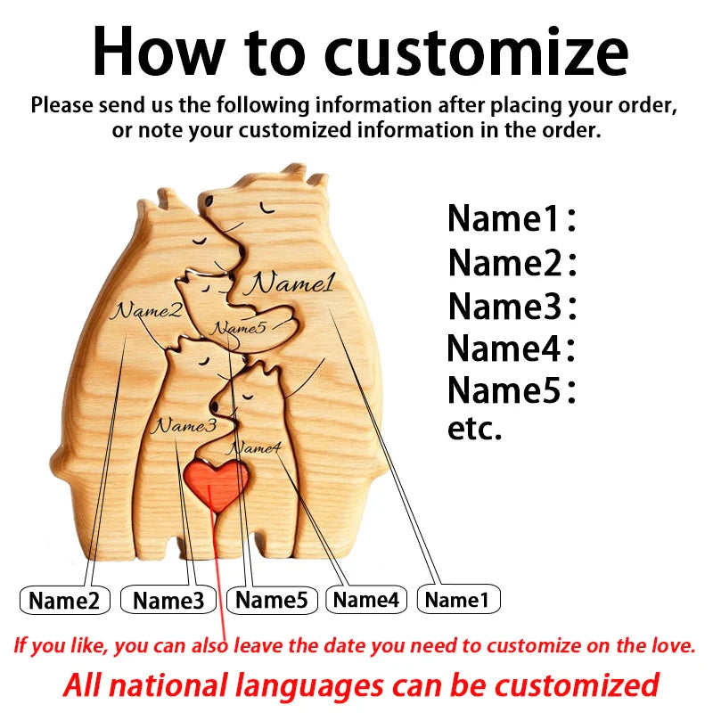 Celebrate family, love, and special moments with our Art Wooden Bear Family Puzzle! Crafted from solid wood and featuring precise laser engraving, this charming puzzle doubles as a customizable home décor piece and a heartwarming gift for any occasion. Perfect for Thanksgiving, Christmas, baby showers, or Mother's Day, it allows you to add a personalized touch by engraving each family member's name — from Dad and Mom to little ones — creating a truly one-of-a-kind keepsake.
