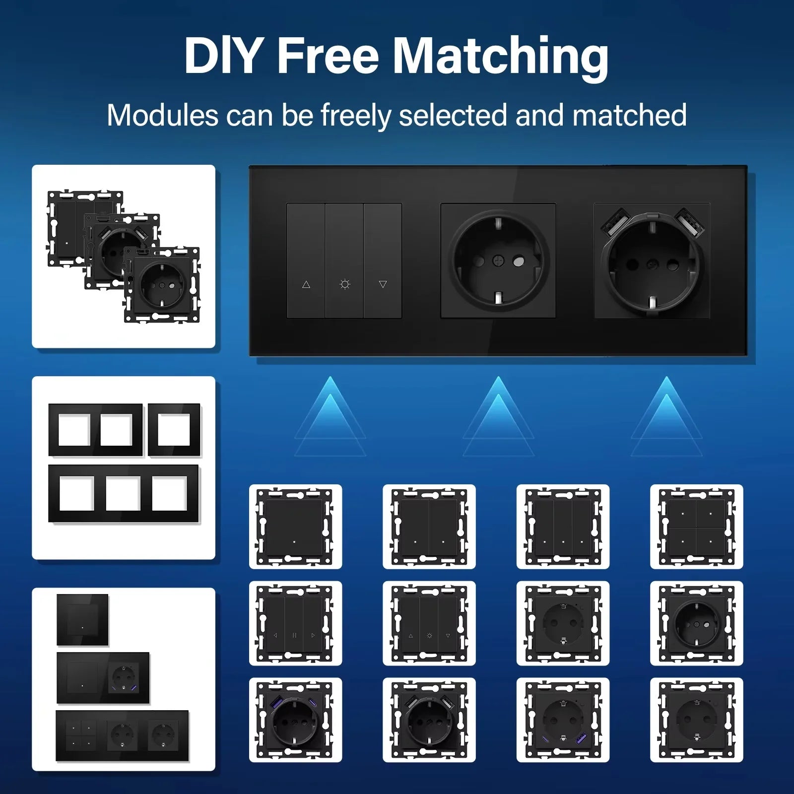 Built with a durable blend of plastic, glass panel, iron plate, and switch module, these pieces are engineered for reliability with 10A switch current, 16A socket current, and a max switch voltage of 1000W per gang. USB ports deliver fast charging at 10W (2.1A) or 20W (3.5A).