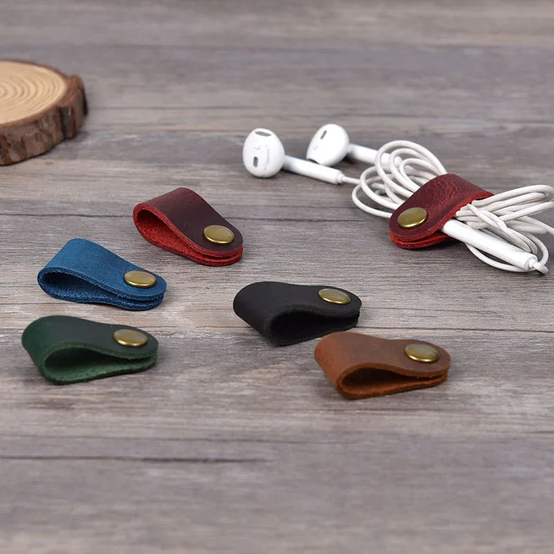 Earphone Wire Organizer – Genuine Leather Cable Winder & Cord Holder, Plug Bobbin Clip for Data Line Wrapping