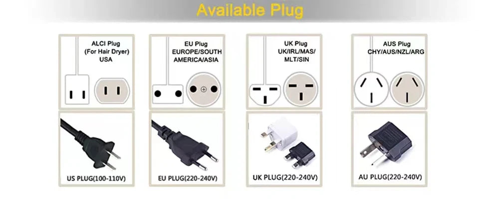Note: UK and Australian plugs require a converter; contact customer service for a free plug adapter if needed.