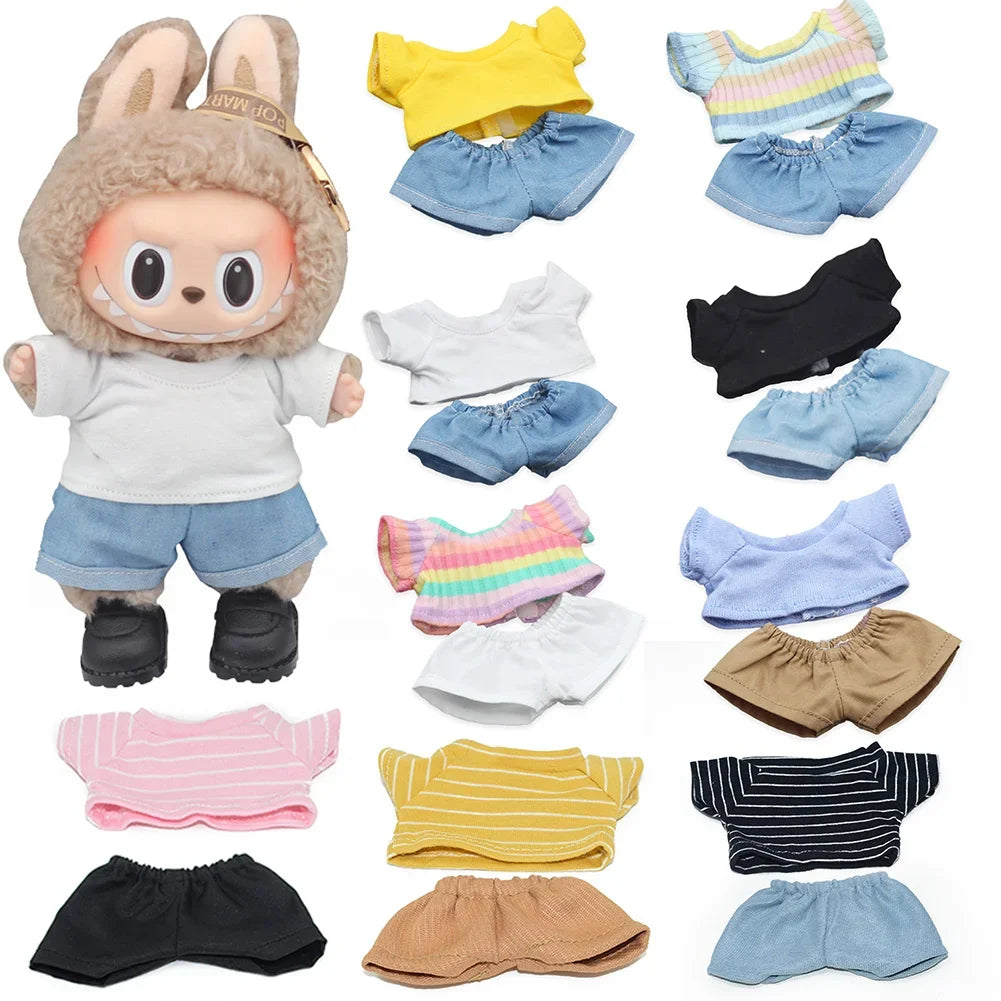 Labubu Idol Doll Clothes Set – T-Shirt & Denim Shorts Outfit for 17cm Labubu & 10cm Cotoon Dolls, Doll Accessories