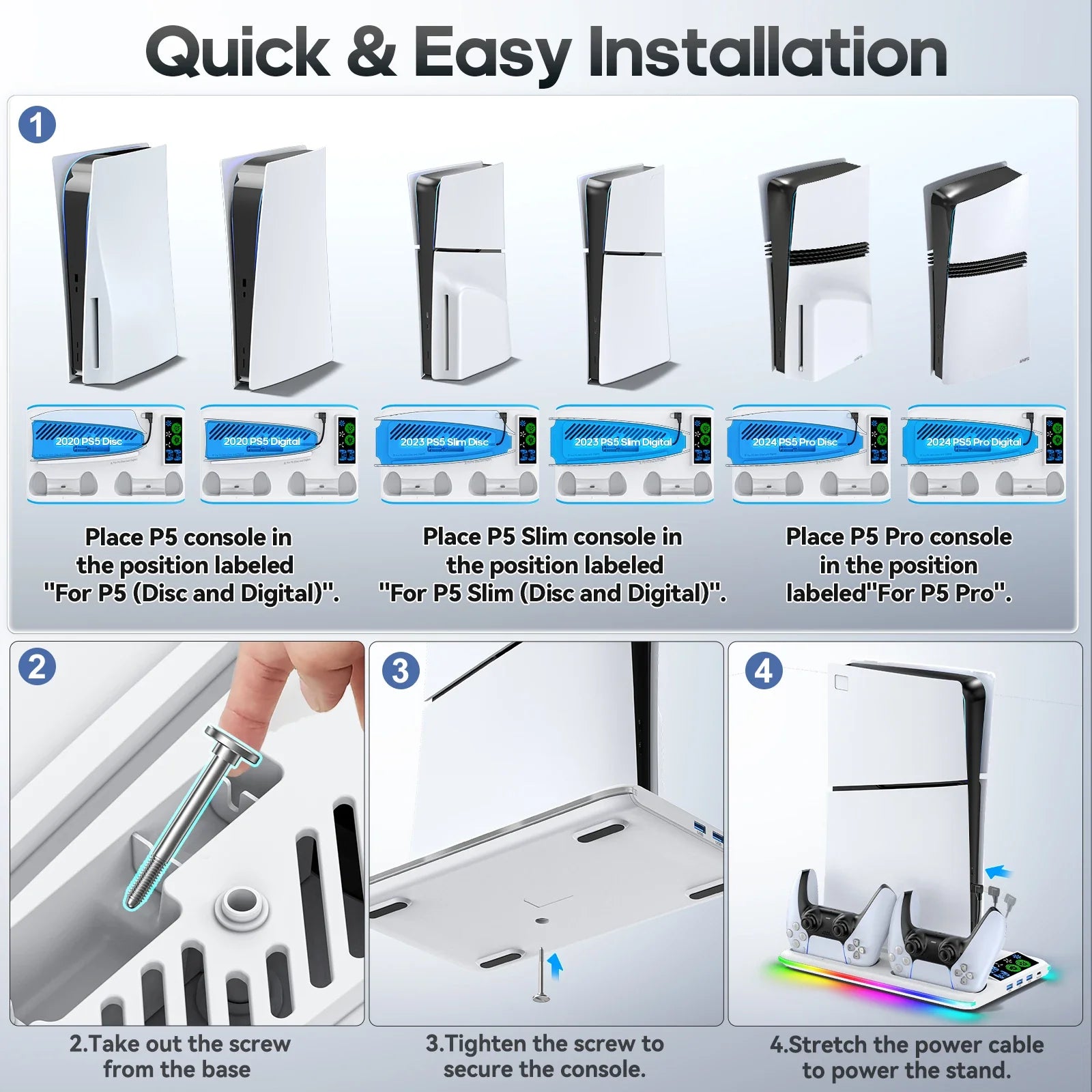 Upgrade your gaming setup with the AyeBeau Game Stand for Sony PS5 Console, designed for PS5, PS5 Slim, and PS5 Pro. This all-in-one support base keeps your console cool, organized, and ready for action while adding a touch of RGB gaming flair.