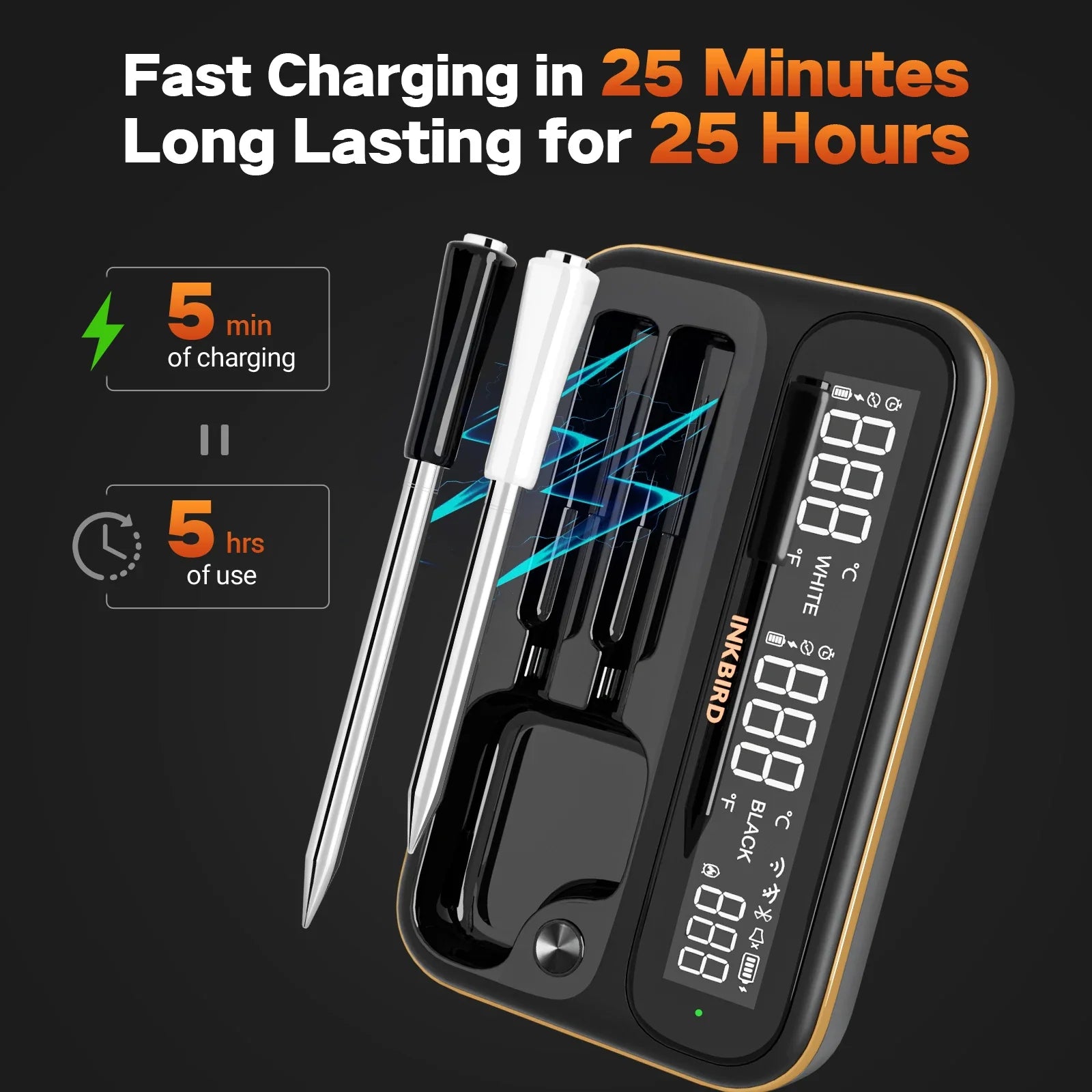 Enjoy smart cooking features with 28 preset meat menus featuring USDA-recommended temperatures, plus multiple alarm and timer functions so you never overcook again. The probes charge fully in just 25 minutes and last up to 25 hours, making them perfect for long BBQ sessions or sous-vide cooking. Whether you’re a beginner or a pro, the INKBIRD INT-12-BW guarantees consistent, mouthwatering results every time.