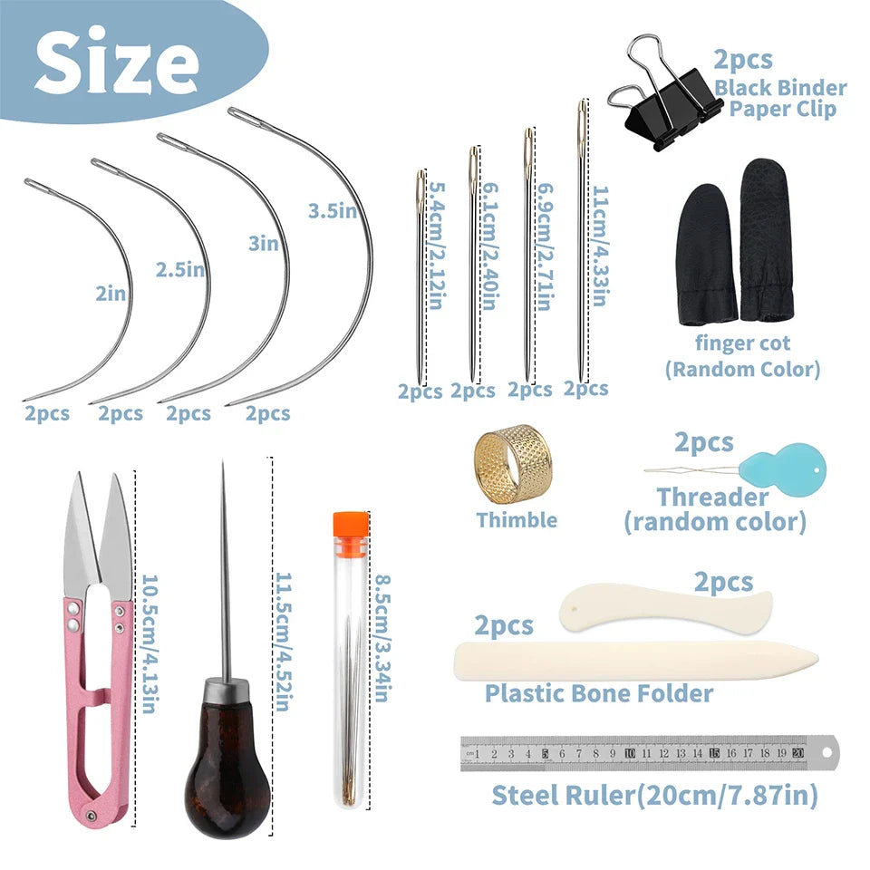 Materials Included: Paper awl, steel curved needles, ruler, wax thread, and more