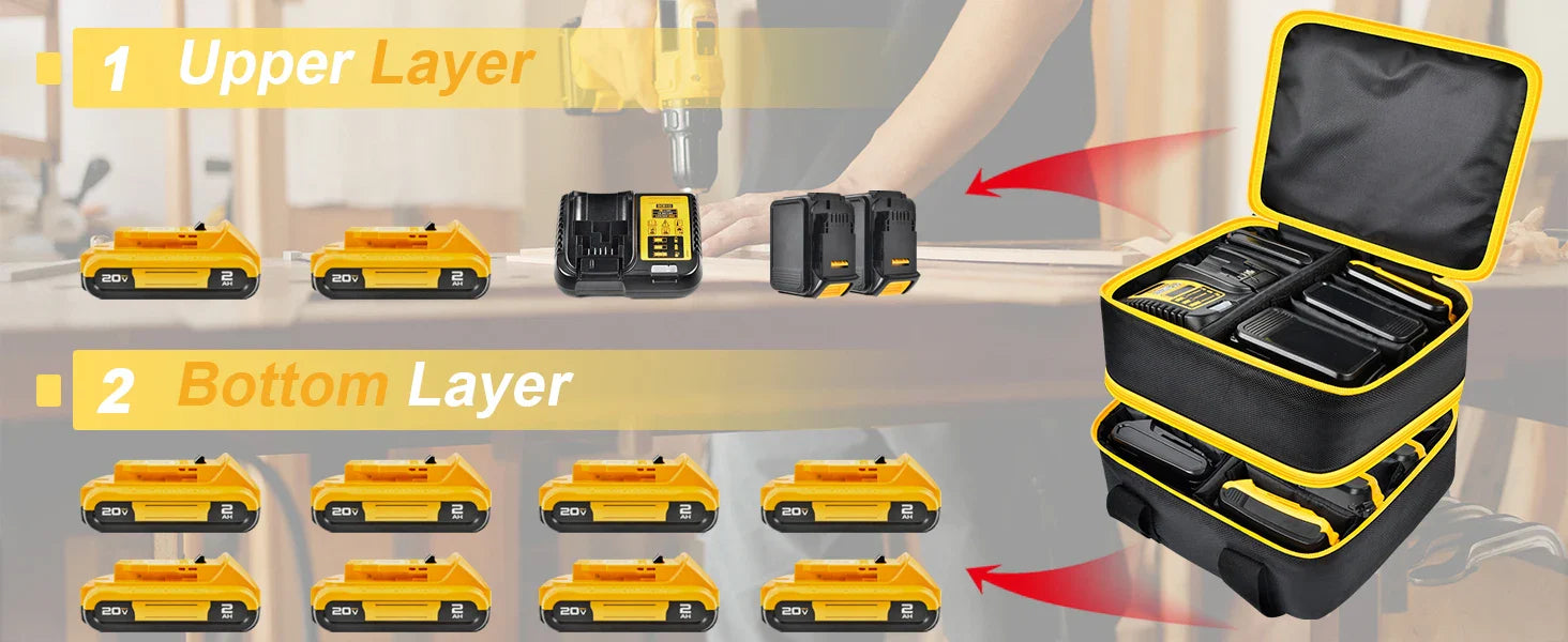 Keep your power tool batteries organized, protected, and ready for action with this Large Battery Storage Bag. Designed to fit DEWALT, Milwaukee 20V/18V/12V batteries and chargers, this durable carrying case (box only) is perfect for professionals and DIY enthusiasts who want a clean, efficient storage solution for their essential tools.