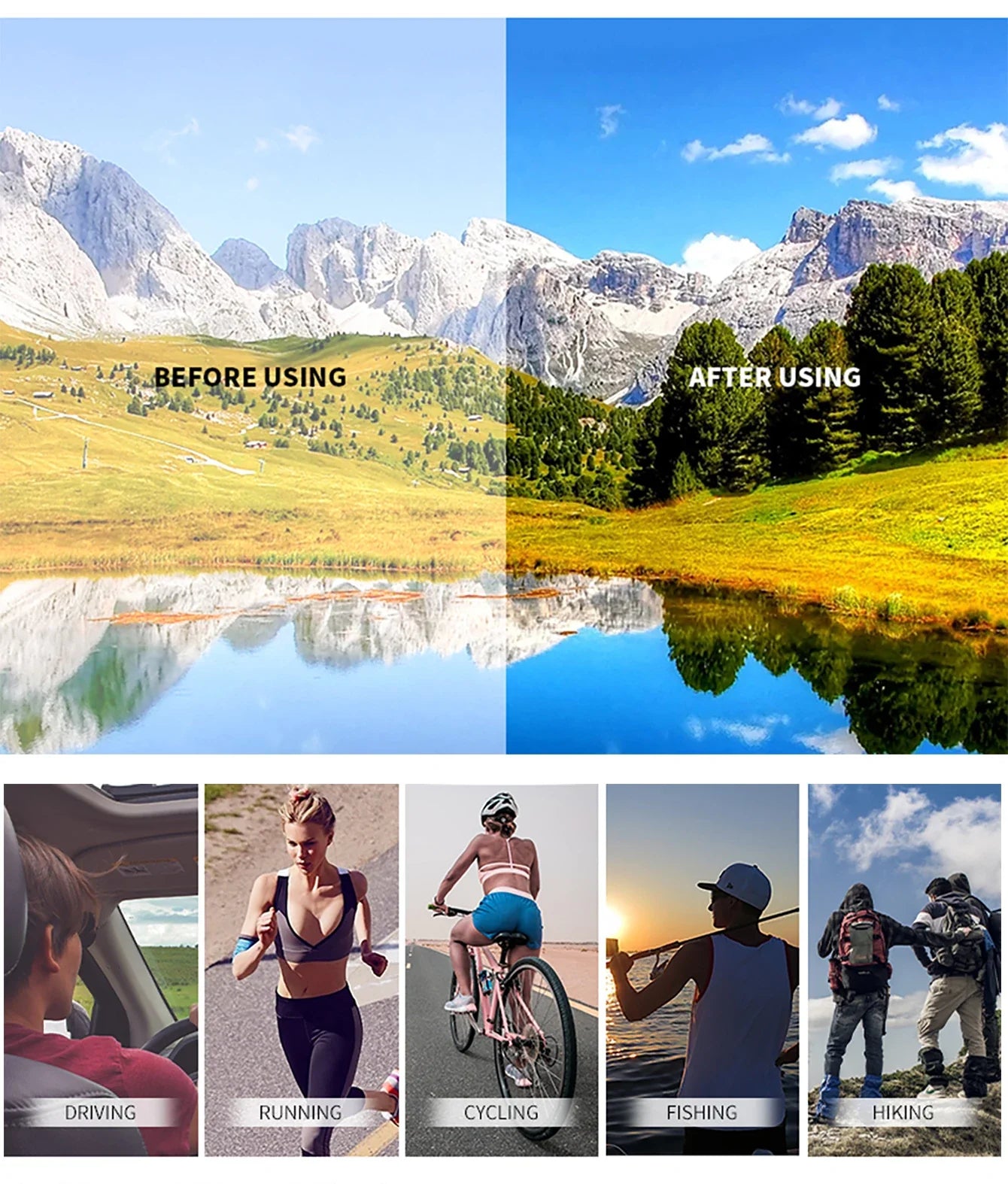 Anti-glare design ideal for fishing, cycling, driving, and hiking