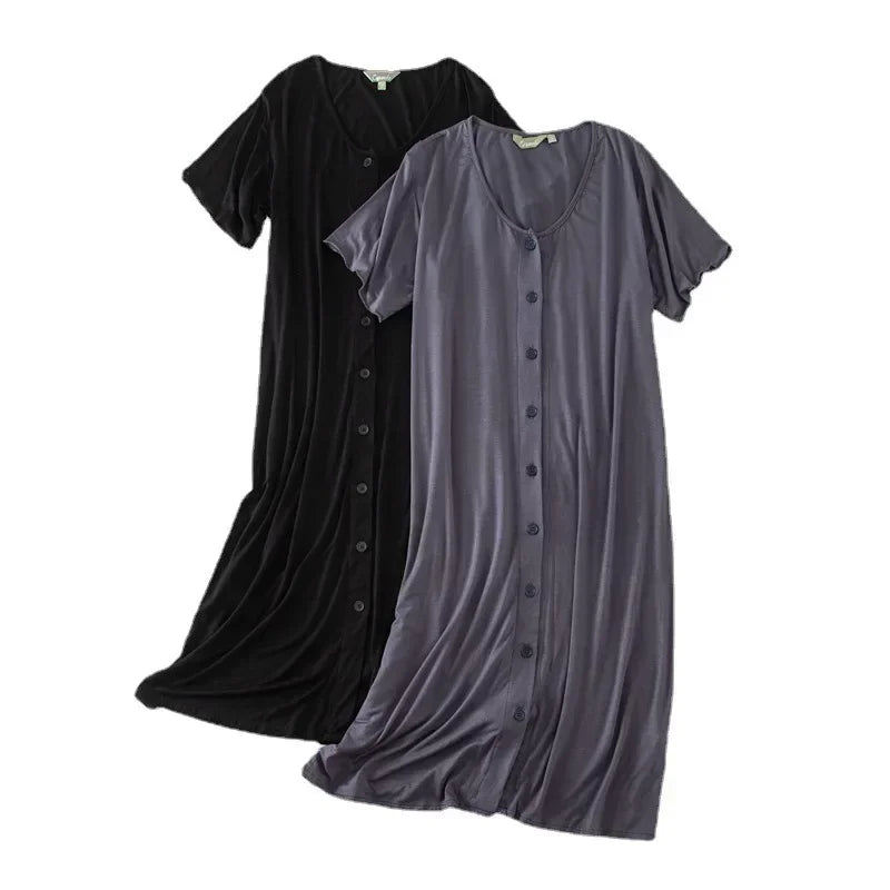 Women’s Modal Short-Sleeve Night Dress – Mid-Length Cotton Sleep Top with Buttons, Plus Size Pajamas