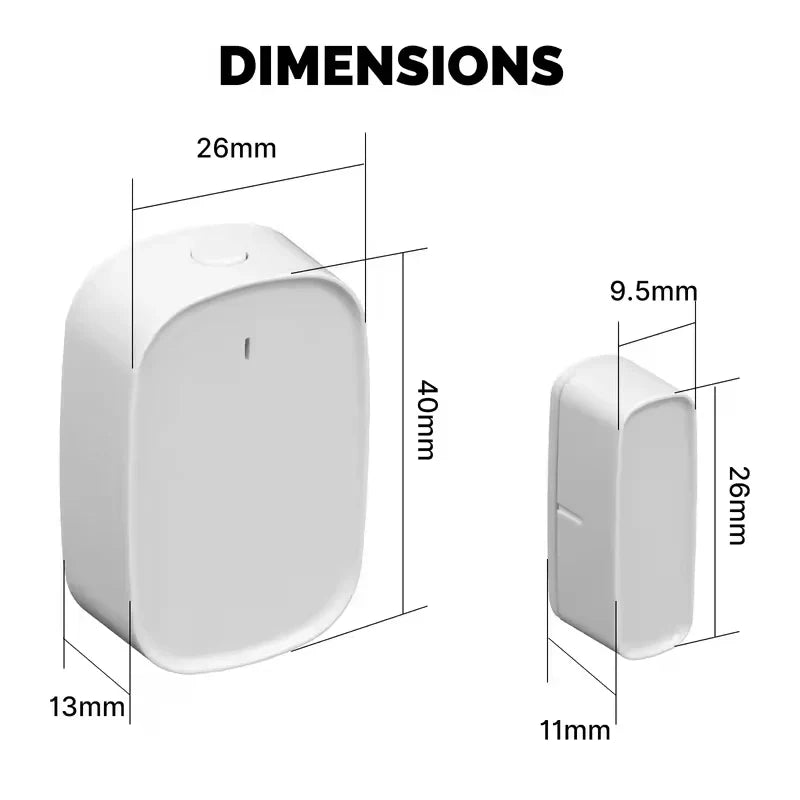 Installation is simple and tool-free, thanks to the included double-sided stickers. With a compact design (Host: 40×26×13mm, Magnet: 26×9.5×11mm), it fits seamlessly on any door or window frame without being obtrusive. Designed to operate in temperatures from -10℃ to +50℃ and humidity between 20–85% RH, this sensor is built for reliable performance in any environment.