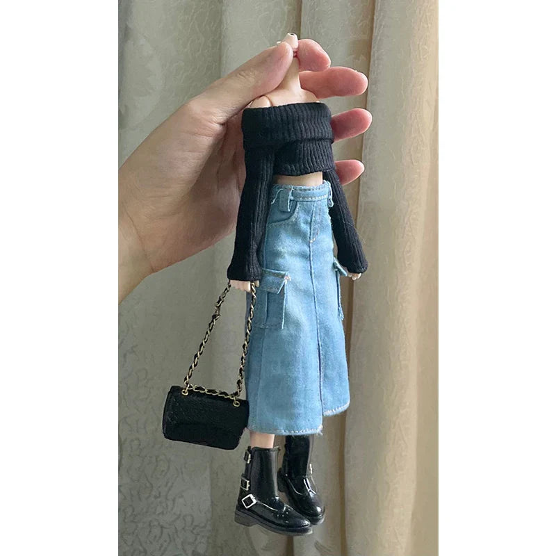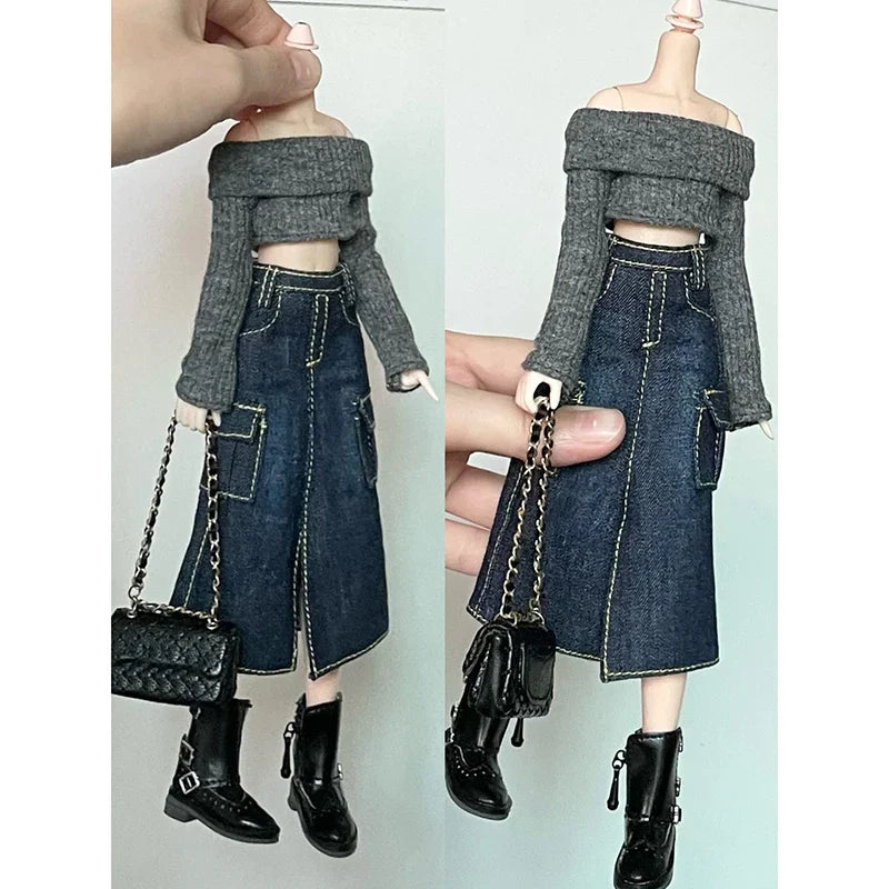 Dress your Blythe or 1/6 OB24 dolls in style with this handmade off-shoulder sweater knit top and split denim long skirt mini dress from DLBell. Perfectly crafted for fashion-forward doll collectors, this modern and chic outfit brings a trendy, realistic look to your doll’s wardrobe.