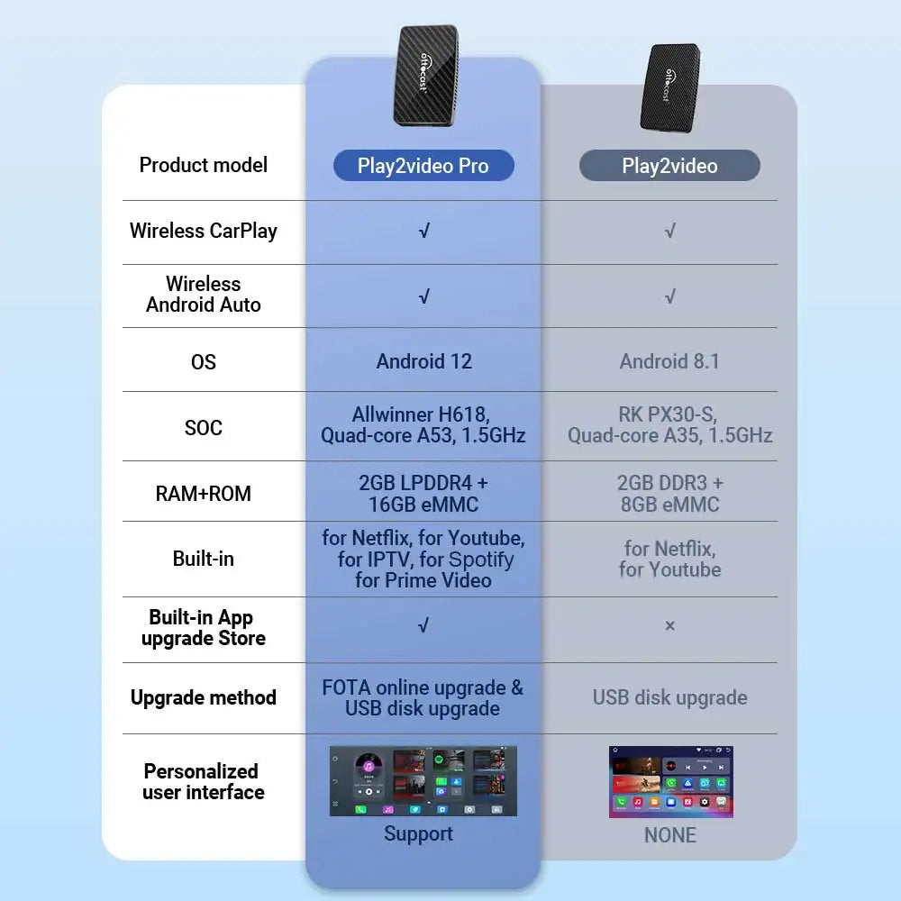 Powered by Android 12 with a 1.5GHz quad-core processor, 2GB RAM, and 16GB storage, the Play2video Pro delivers fast and stable performance. The plug-and-play design means setup is effortless—simply connect to your car’s USB port and start streaming. Compatible with both iOS (10.0+) and Android (11+) devices, it supports multitasking, voice control via Siri and Google Assistant, and ensures a smooth, cable-free experience.