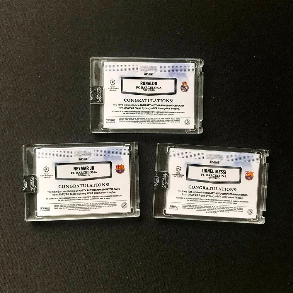 Authentic jersey material cards featuring Messi, Ronaldo & Neymar