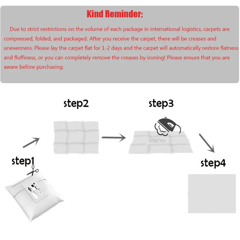 Vacuum-Sealed Packaging: Slight creases are normal; allow 1–2 days for the rug to fully fluff.