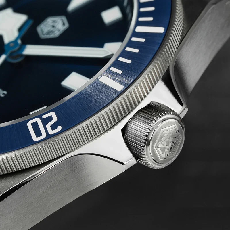 The matte black or matte blue dial features BGW9 luminous hands and markers, making it effortless to read even in low-light or underwater conditions. The sapphire crystal with AR coating protects against scratches while offering crystal-clear visibility. The screw-down crown and case back, along with a folding titanium clasp with safety, provide secure wear during intense activities.