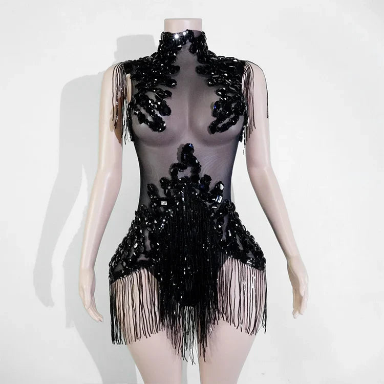 Turn heads wherever you go with this gorgeous black spandex jumpsuit, designed for women who love to shine on stage, at parties, or during special events. Adorned with sparkling silver sequins and rhinestones, this outfit creates a mirror-like dazzling effect that catches every spotlight, perfect for dancers, singers, or show performers.