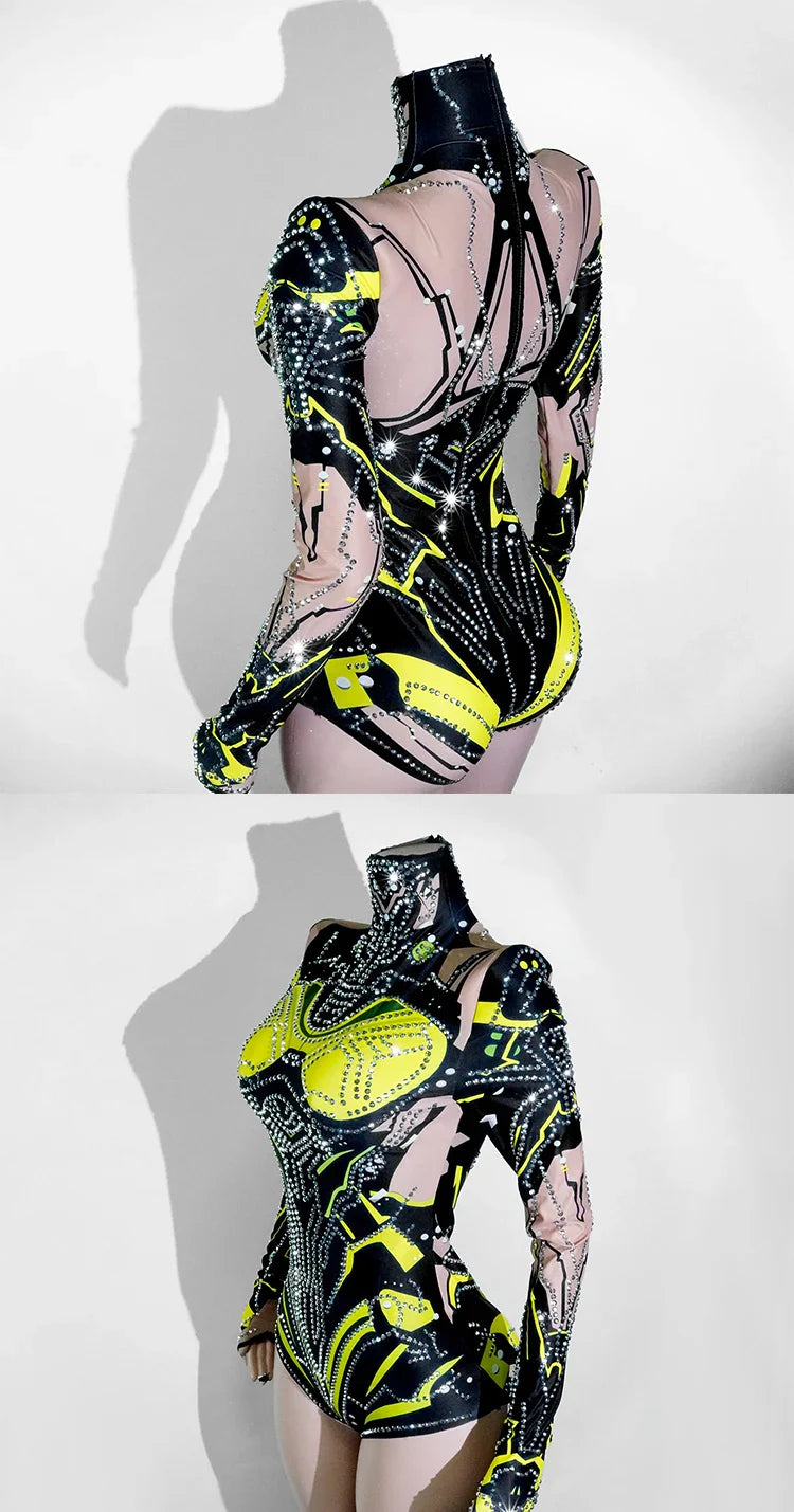 Sexy Sparkly Green Rhinestone Bodysuit β Stage Dance Costume for Party, Bar Show, Drag Queen, Cosplay & Halloween