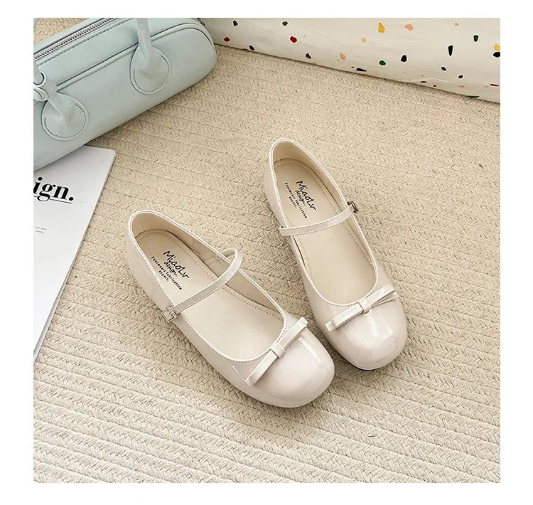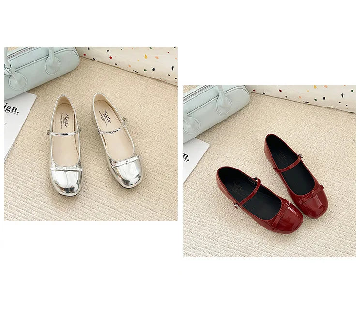 Spring Autumn Wine Red Mary Jane Shoes – Women’s Low Heel Leather Flats with Butterfly Knot & Round Toe