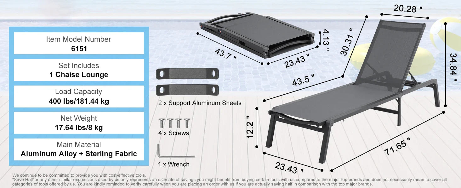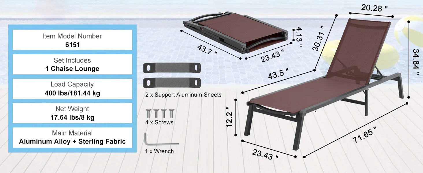 Experience ultimate relaxation with the SucceBuy Chaise Lounge Chair, designed to elevate your outdoor leisure time. Crafted with a durable aluminum alloy frame and premium Sterling fabric, this folding patio lounge chair is perfect for your patio, pool, beach, or garden. Its lightweight and foldable design make it easy to move, store, and enjoy wherever you like.
