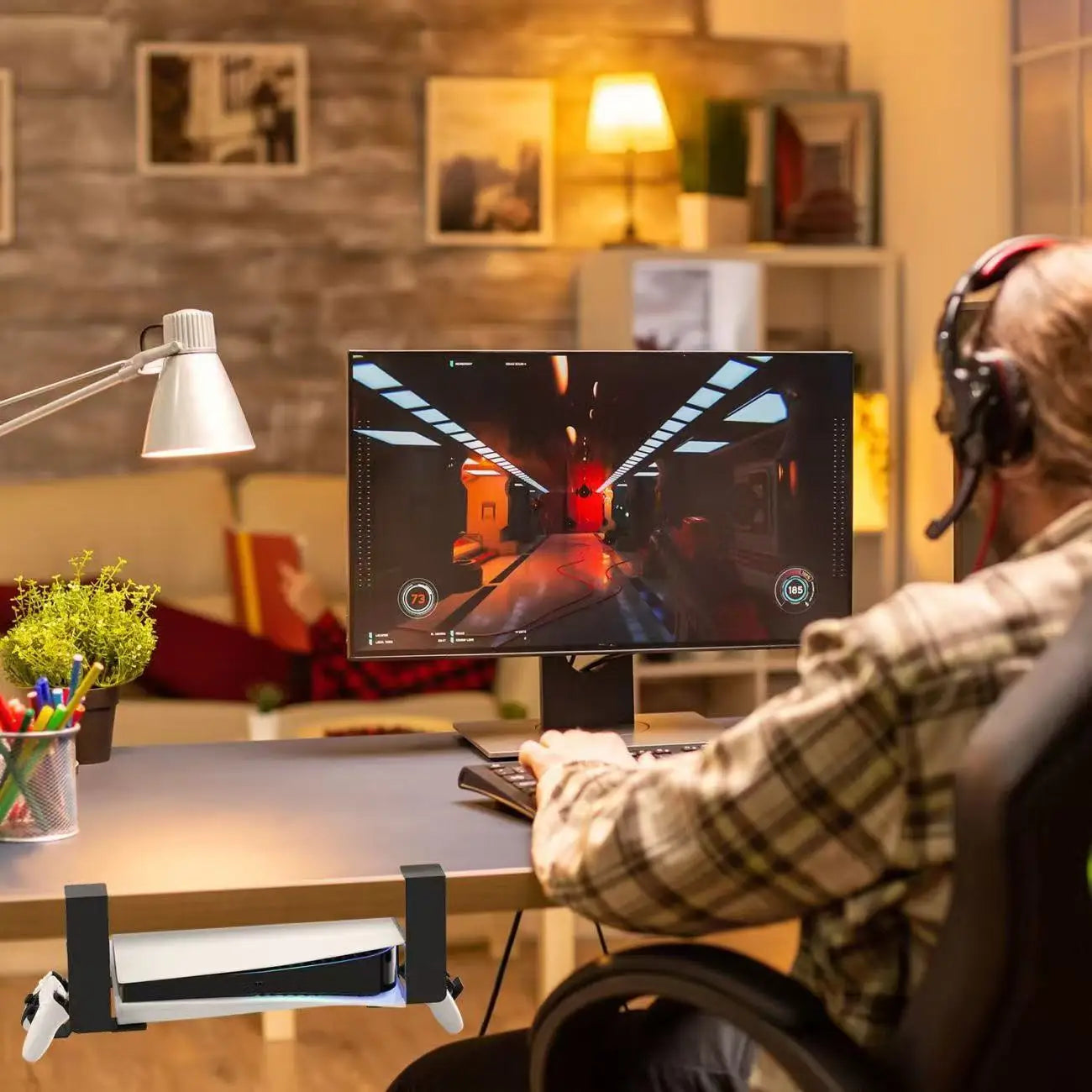 Perfect for gamers looking to save desk space, it provides a stable and durable platform for your console while maintaining optimal airflow. Easy to install and compatible with all PS5 models, this mount ensures your console is safely tucked away yet easily accessible for gameplay. Ideal for home, office, or gaming room setups, it combines practicality with sleek design for a clutter-free gaming environment.