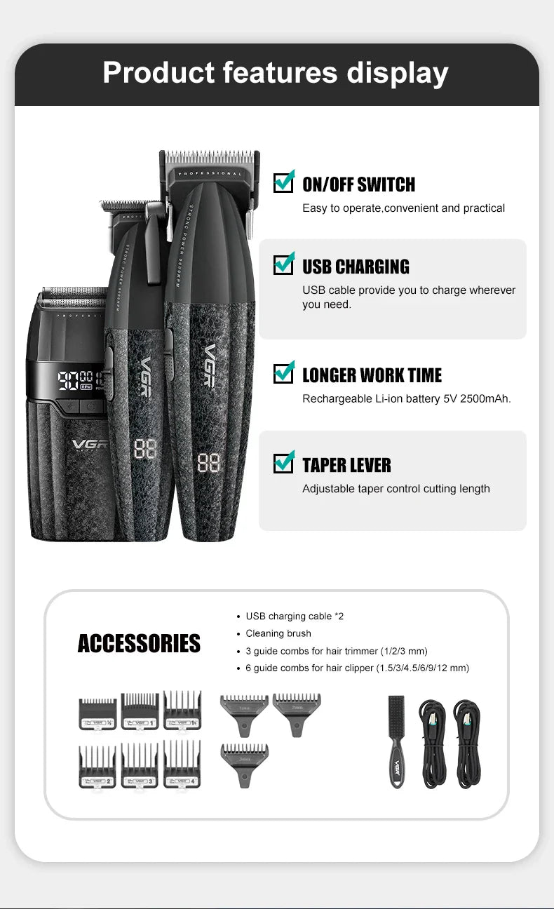 Upgrade your grooming routine with the VGR V-640 S3 Hair Clipper, a professional-grade 3-in-1 grooming kit designed for precision, speed, and versatility. Equipped with a high-speed 9000RPM motor, DLC-coated blades, and a dual black titanium foil shaver, this all-metal hair clipper set delivers smooth, snag-free haircuts, flawless beard sculpting, and irritation-free shaving. Ideal for home or professional use, it’s perfect for men seeking clean lines, fades, and a polished look.