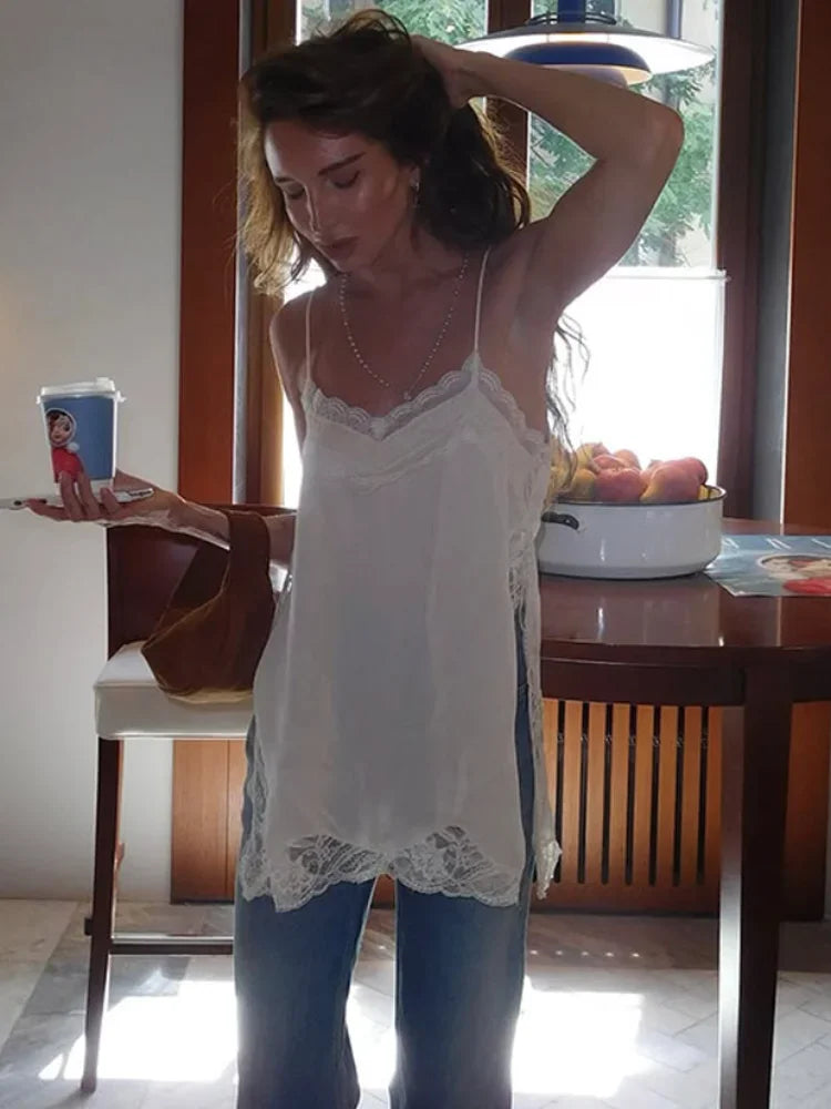 The lace patchwork detail adds a delicate, see-through touch that elevates the design from simple to stunning. With its square neckline, sling straps, and subtly backless silhouette, this top enhances your natural shape while keeping the look refined and elegant. The solid color design makes it easy to pair with high-waisted jeans, tailored trousers, mini skirts, or sleek heels for a polished party-ready outfit.