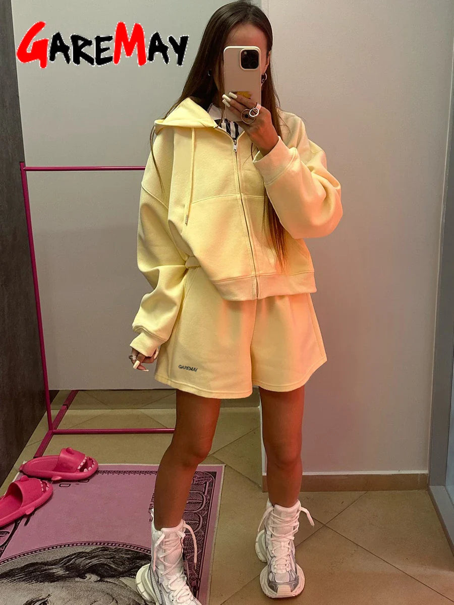 Women’s Summer Yellow Tracksuit – Cotton Zipper Top & Shorts Two-Piece Casual Sports Set